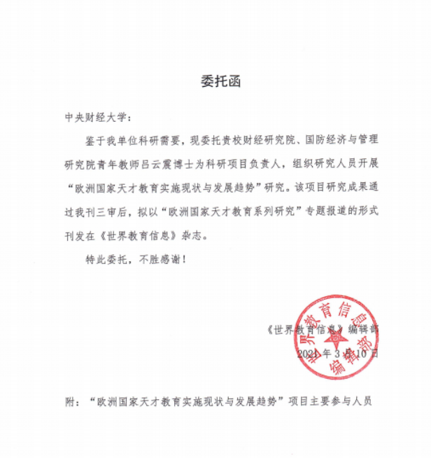 近日,由教育部主管、教育部教育管理信息中心主办的国家级国际教育类综合期刊《世界教育信息》编辑部来函我校,委托我院青年教师吕云震开展“欧洲国家天才教育实施现状与发展趋势”专题研究。这对我校在教育科学领域尤其是国际比较教育方向的发展以及进一步开展教育科学研究起到了积极推动作用。