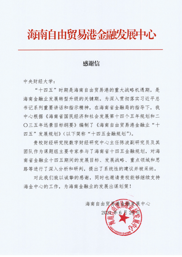 2021年6月29日,海南自由贸易港金融发展中心向我院数字财经研究中心发来感谢信,信中表示: