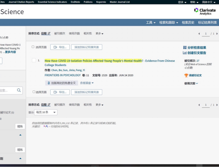 据科睿唯安ESI(Essential Science Indicators)最新数据显示(2021年7月更新),我院数字财经研究中心主任陈波副研究员以第一作者发表的论文入选ESI高被引论文(highly cited paper)。该文在国际上较早的定量研究评估了新冠疫情隔离政策对公众精神健康的全面影响,受到较多关注。自2020年7月发表一年时间以来, Web of Science核心合集被引27次,谷歌学术被引55次。