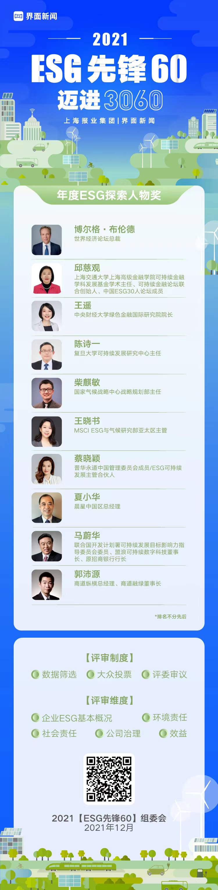 界面新闻是中国具有影响力的原创财经新媒体,由上海报业集团出品,2014年9月创立。2021“ESG先锋60”评选,旨在寻找经济效能与社会责任并重的绿色企业与业内先锋人物,不限参与企业的所有制类型、国别、规模以及所处行业。评选综合考量了企业ESG的基本概况、环境责任、社会责任、公司治理责任以及效益五大维度,多渠道评选卓越企业,力求对企业的年度价值和ESG表现作出客观、公正的评价,展现企业在“碳中和”时代下的核心竞争力。