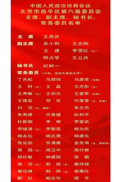 2021年12月16日,中国人民政治协商会议北京市昌平区第六届委员会第一次会议进行大会选举。委员以无记名投票的方式,选举产生了新一届区政协主席、副主席、秘书长、常务委员。我院王卉彤研究员当选为政协北京市昌平区第六届委员会常务委员。