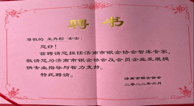 2022年6月,我院王卉彤研究员被聘为济南市银企协会智库专家,为济南市银企协会及会员企业发展提供专业指导与智力支持。